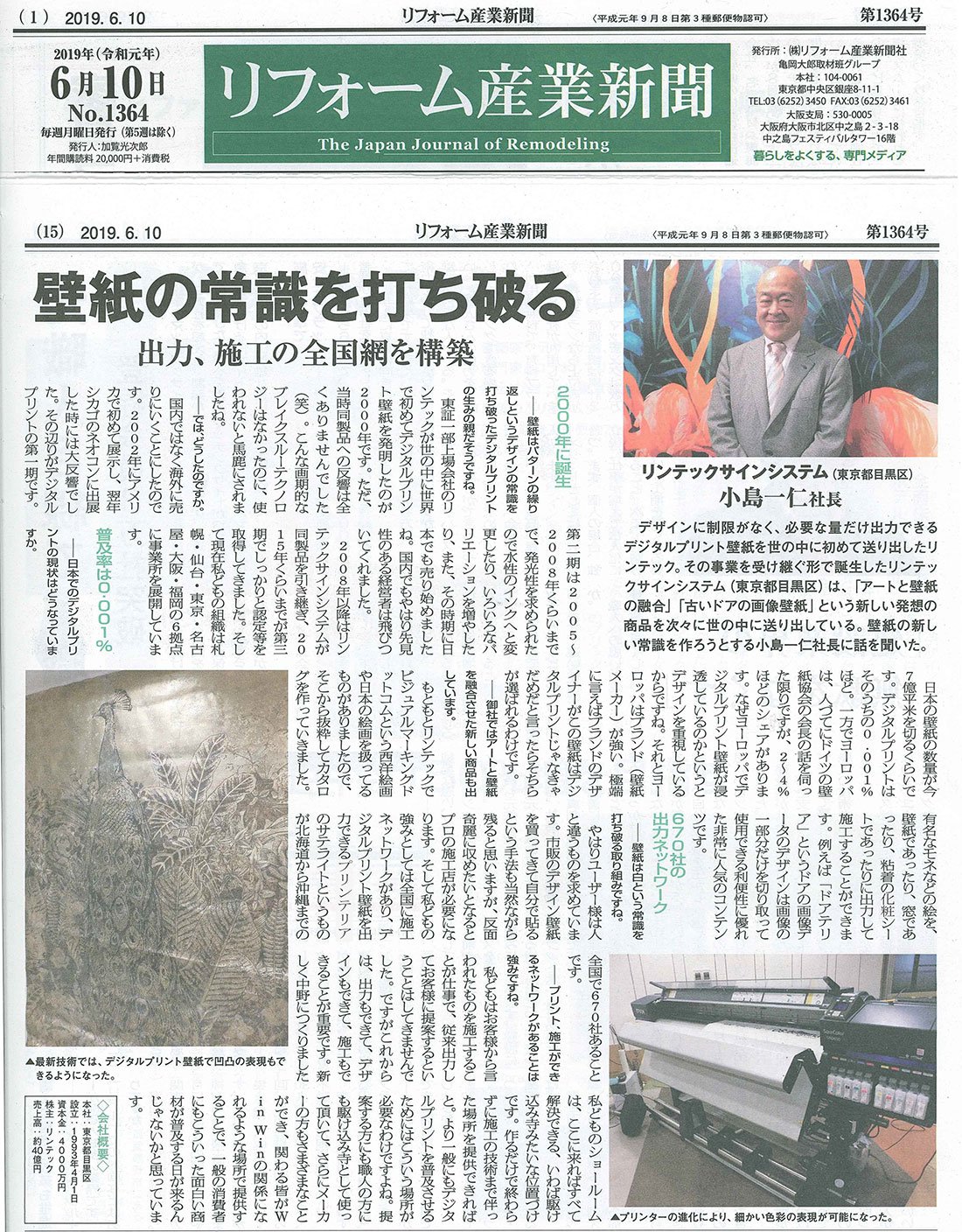 2019年6月10日発刊の「リフォーム産業新聞」にデジタルプリント壁紙の開発当時の誕生秘話などについてや、当社ショールームについての取材記事が掲載されました。![]()