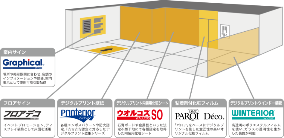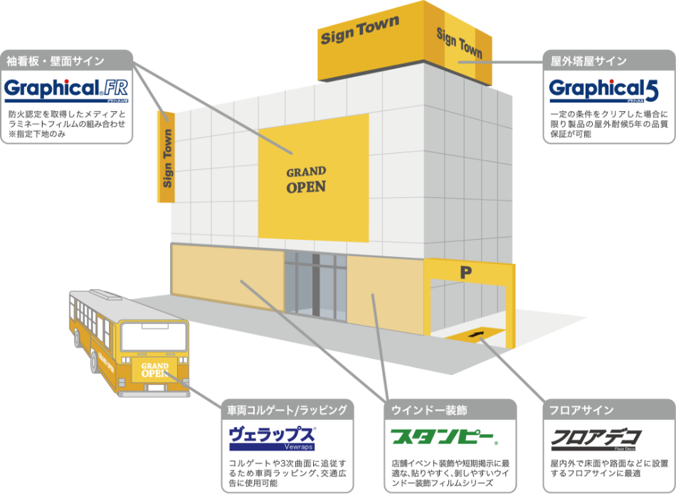 「グラフィカル」では、使用用途、掲示期間、施工環境、また法規制等、屋内外の看板サインディスプレイ、内装材といったさまざまなニーズに応じた各種メディアやラミネートフィルムをご提供いたします。