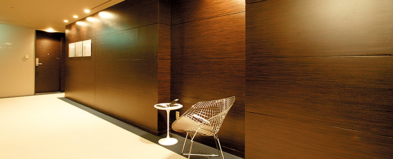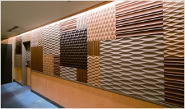 複雑に三次元加工されたケイカル板にパロアを貼り込んだ内装用化粧パネルです。照明との融合でワンランク上の空間演出を実現します。